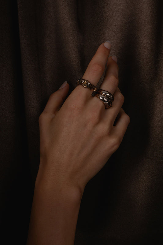 At a young age, the designer traversed these very sands, her journey to North Africa weaving into her life's rich tapestry. This collection is a homage to the mystic of deserts, to tales woven in the era of time. It melds the aged elegance of silver with the warm glow of golden bronze. This fusion transcends the ordinary, reaching into the majestic and surreal realms.